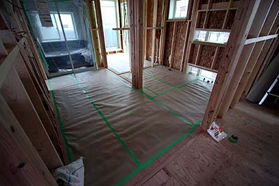 こちらはフロアタイルを張る予定の場所。養生シートが貼られていた。