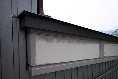 なぜここだけ白いのか疑問だった破風板。外壁に合わせて塗装が始まっていた。ハケ塗りだね(笑)。