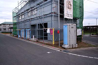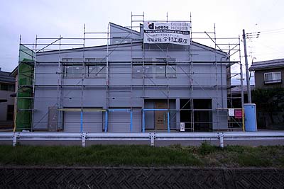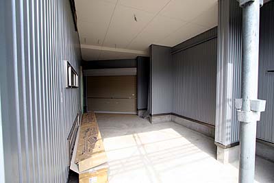 北側開放ガレージ内側の外壁処理(?)が完了。手前に見えるのは足場のパイプ。