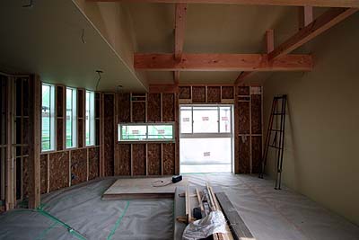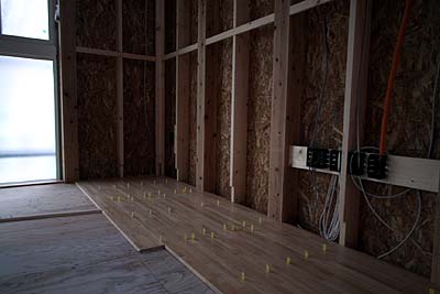 リビングのフローリング貼りが始まっていた。リビングも格安提供して頂いたムク材なのだが、寝室側とは色を変えた。寝室側は落ち着いた感じの濃い色に、リビングは明るい色にしてみた。ムク材は、しなりが出たり隙間があいたり、ギシギシ音が出たり、色々と暴れる素材だ。それが本来の姿なのだが、それを嫌って安定した合成素材が普及した。 しかし、冬場の床の冷たさは合成素材とムク材では雲泥の差となる。 コレは実際に今村工務店の見学会や、今村工務店で建築したH氏の家などで確認済み。 今村工務店ではムク材の良さを積極的に提案、施工実績も多数有るようだ。