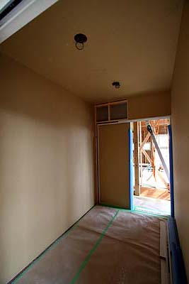 寝室側も養生シートに覆われている。壁や天井の耐火ボードもほぼ終わっている。 一部だけ壁が貼られていないが、ココは違う仕上になる予定。