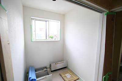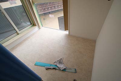 サンルーム。壁にクロスが貼られて、床にフロアタイルが貼られた。壁の一部は別の仕上になる予定。