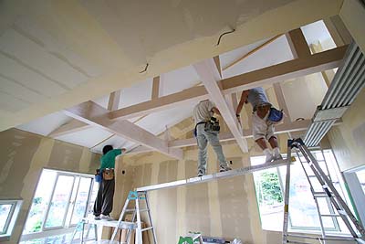内装屋さんが3人で天井クロス貼り。勾配天井なので作業性最悪(^^;;