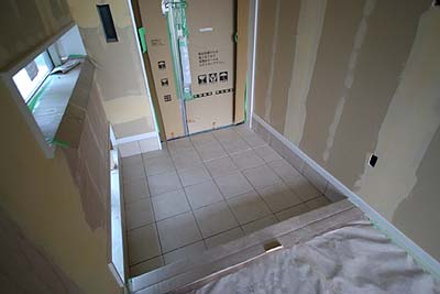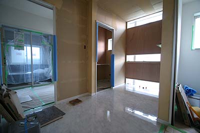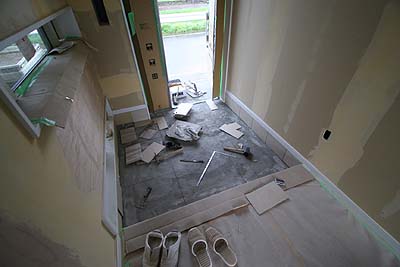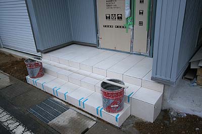 玄関土間にタイルを貼る工事も進行中。朝の写真がコレで...