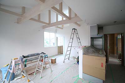 リビングのクロス貼り終了。一気に明るくなった。壁が白くなるだけで空間のイメージは大きく変わる。画面中央の大きな脚立の向こう側の壁にはこの後、PCデスクや収納となる造作家具が付く。
