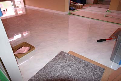 洗面台が設置されるホール部分。大理石風味なフロアタイル。