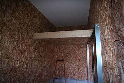 夕方にはロフトが出来たっ!(^o^) 高さ1800mmでロフトを作った。ここは普段出入りするわけではないので、多少圧迫感が有っても構わない。頭が当たらない程度の1800mm天井でその上をロフトにした。この上には純正シートとか筑波決戦用羽根付きトランクリッドとかバンパーカウルなどが収納される予定。その下にバイクと自転車。