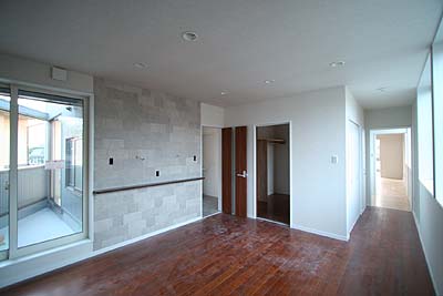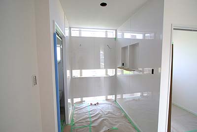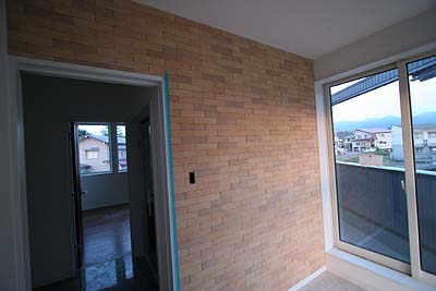 寝室の壁の一部にもエコカラットを使った。こちらは部屋の体積に対して施工面積が足りない為、十分な調湿効果は得られないと思われるが、壁デザインのアクセントとして使った。メーカが推奨する施工面積には足りないが、それでもある程度の調湿効果は期待出きるらしい。ちなみにこのエコカラット、霧吹きでバシバシ水を掛けてもどんどん吸い込む多穴質素材だ。