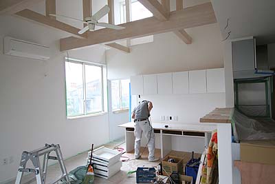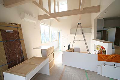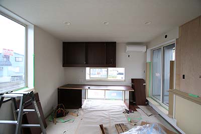 造作家具を付けている職人さん、偶然ながら古い知り合いだった。十数年ブリに会ったような気がする(^^;