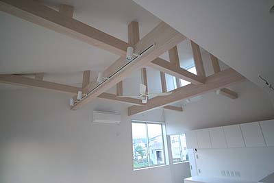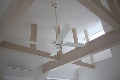 シーリングファンが付いた。冷暖房効率を上げるのに有効かと。ファンの真ん中にはあとで照明を追加出来るモノを選んだ。 万が一、梁に付けるライトだけで照度が不足した場合、ファンのセンタに照明を追加するか、梁に付けたレールにも照明を追加出来る。