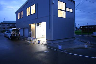 照明が付いたっ!(^o^) 北側角もコンクリートが打たれて外部駐車スペースが完成。夜遅くまでルームクリーニング業者が入ってお掃除していた。