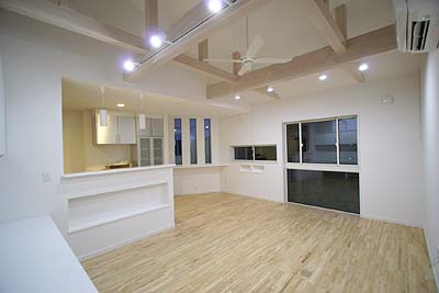 下からリビングを見上げる。道路を歩くヒトから見ると天井しか見えない。これが2階シビングの良さ。