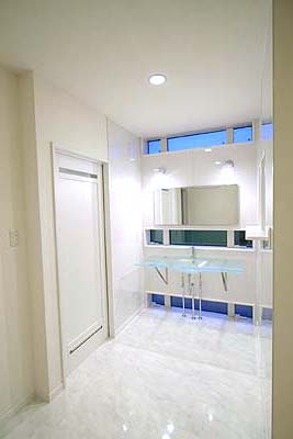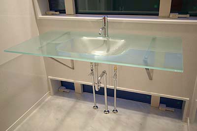 継ぎ目が無い一体整形のガラス製洗面台。 昼間だと下部の窓からの光が床を明るく照らし、ガラスのシンクが明るい空間に浮いているように見える。シンクとミラーと照明の位置を考えた3連横長窓だったのである。