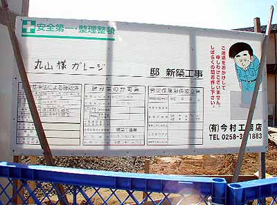 工事現場の看板も設置。「丸山様ガレージ邸 新築工事」(笑)。こういうノリに付き合って頂いて有難うございます > 担当H氏 & 今村工務店様