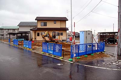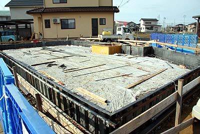 が、北側の角にも同じようなモノが? ハテ? コレはナニ??? 電話で担当H氏に確認すると、どうやら水道の配管とメータの設置部分らしい。電力のメータを壁の内側に設置するようにお願いしたのだが、水道メータも含めて同じ場所に集中配置する計画らしい。鉄筋準備はほぼ終わり、明日にでもコンクリを流したいらしいが、天候が冬型で寒くて雨や雪の気配が有る。で、1日待って天候が回復しそうな4月2日にコンクリを流し込む事になった。
