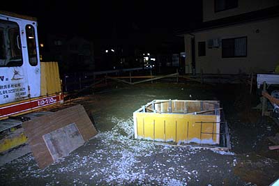 エレベータホールは池になってた(^^; が、コレは池になってるって事はコンクリが固まってるって事で、水が捌けてる方がマズいと職人さんが言っていた。確かに。水が染み込むようならコンクリが乾いてないって事で...(^^;