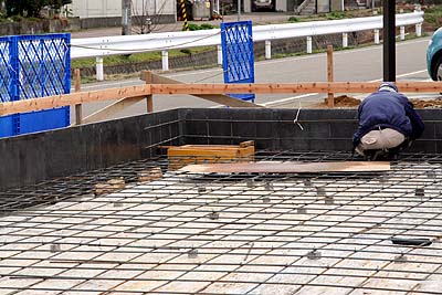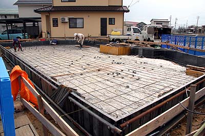 200mmくらいのピッチで鉄筋を敷き詰めていた。ベタ基礎コンクリの厚さは150mmで、その上に30mmの上塗りをする設計。更にロドスタガレージ部分はカラクリート仕上になる予定。基礎の立ち上がり部分が少なく、ほとんどフラットな土間なので、超巨大な基礎に見える。ウチの場合、1階部分はほとんど土間なので、基礎が完成すると基礎だけでも1階の形状がすべて見えてくるハズだ。基礎完成=1階の床が完成(笑)。