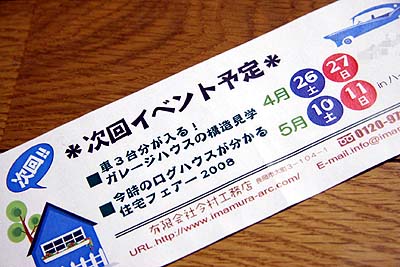 こんなモノも送られてきた。と言うわけで、どうやら4月26日にはウチの構造見学会が有るらしい。見学希望者っていますか?(^^;;