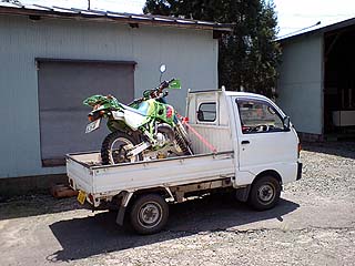 ビール監督から軽トラを借りて引越し。軽トラが有るならバイクも一人で運べる。積む時はバイクに乗ったままエンジンパワーで走って荷台に登った。オフロード乗りにとってはこんな事は朝メシ前なのだが...降ろす時はちょっと悩んだ(^^; 荷台の下から荷台上のバイクを操作すると落差が大きすぎて大変。背が高いオフロードバイクを荷台から下ろすのはちょっと大変...(^^;; いや、慣れてるヒトはどぉって事ないんだろうけど。