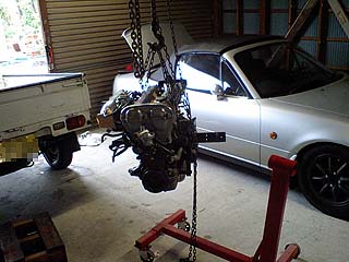 最大の難関はこのエンジンだ。 ガレージではチェーンブロックが使えるので楽。持ち上げてエンジンスタンドから外し、パレットを取り付けて軽トラに載せた。 問題は茶太郎's納屋で降ろす時。茶太郎's納屋にはチェーンブロックを掛ける場所が無い。ハンドパワーで降ろすしかない。 いろいろ考えた。結局、ラダーレールを軽トラに付け、ラダーレール上をずるずると引き摺るようにエンジンを下ろす。ラダーレールの脇にエンジンスタンドを構え、エンジンの高さが丁度良くなったときに横からエンジンスタンドを取り付けた。 うひょ。巧く出来た(^^)