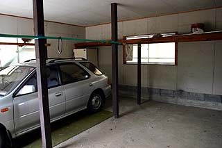 試しに銀プレッサバンを入れてみる。柱が邪魔だが贅沢は言えない。2階がモノ置きになってるので1回部分はかなり整理されて広々と使えるハズ。しかし、奥行きと柱の位置の関係で今までのガレージより足回りの分解などの作業はやりにくい。それでも雑荷物やパーツを2階に置けるので1階の作業スペースは広く使える。このガレージを借りてしまおうか...。