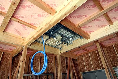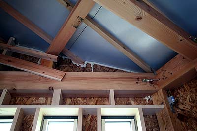 構造用合板と壁や屋根との隙間は建築用の発泡ウレタンを充填して気密度を高めている。これこそ高気密高断熱構造。