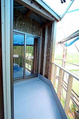 ベランダのFRP防水工事が完了していた。奥に見える掃き出し窓は寝室の窓。画面左側にフロが有る。フロの窓はこのベランダに通じる。坪庭風にして露天風呂風味を盛り上げてみたい。