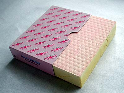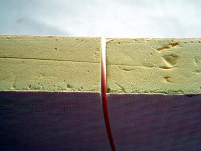 手に入れたのはネオマフォームの 80X120mm t=25mm のサンプル片だ。 カッターで切断して新しい断面を出してみた。超高密度な発泡状になっているようで、見た目では空気を含む穴は良く見えない。しかし、超軽量なので空気を沢山含んでいると思われる。