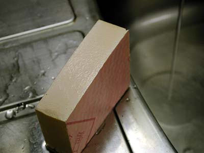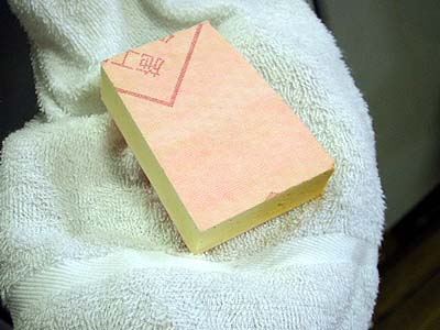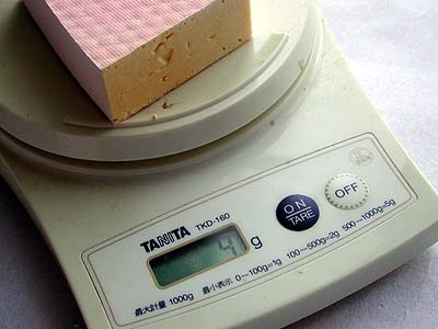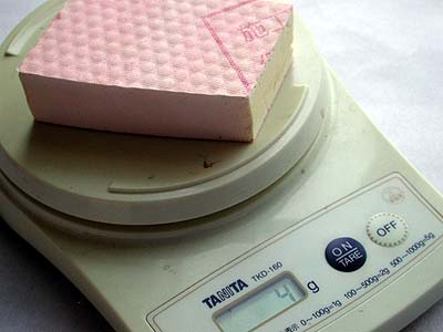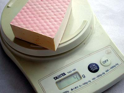 2つに切断したウチの1個を水に付けて変化を調べてみたい。実験前の重量は4gだ。 コレを水に付ける。僅か1ccの水を吸うだけでも5g程度になるハズで、もしも吸水性が有るのならその変化は計測できると思われる。
