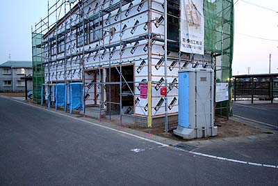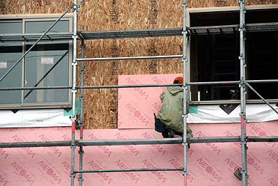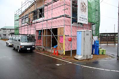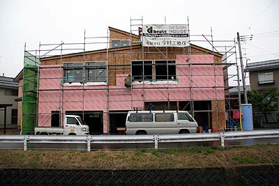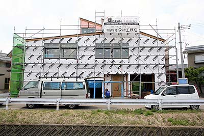 旭化成が推奨する施工方法では、そもそもネオマフォームは耐水性が高い為、防水シートの必要は無いとされている。 しかし、今村工務店では、ネオマフォームの上に更に透湿防水シートを貼る。これにより、一部の反ネオマフォーム陣営が主張するネオマフォームの耐水性の問題も解決出来る。というわけで、一面に防湿シートが貼られた。ちなみに、ネオマフォームを貼った直後に構造見学会をやっている。上の画像の防水シートを全面に貼ったの構造見学会の翌日。ちょっと前後してしまうが、次回は構造見学会の様子をレポート予定。