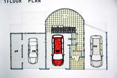 画像の上が西になる。北端のガレージはドライブスルー構造としたのはウチからの提案。ドーム状のRを描くホールはガラスブロックを組上げたデザイン。そのホールの上にはサンルームやバルコニー。 ゆとりのくつろぎスペース? 友人などが来た時には楽しい空間になるカモしれない。 しかし、西向きのガラスブロック、冷暖房が無いと快適に使える季節は限られそう。また、大量のガラスブロックを組上げるコストも...? ま、冗談同然とは言え奇抜なアイディアとして提案してくれた事を評価したい(笑)。しかし、階段を横向きに配置するアイディアは初出。これを巧く発展されば使える??