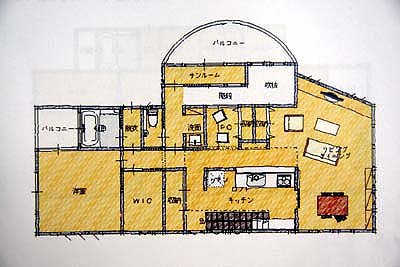 2階部分。南側の寝室、そこに面したバルコニーとフロ。この辺は良い。が、北側にリビングが狭く感じる。また、キッチンの目の前が壁と言うのも気分が良くない。PCスペースもナニやら狭い空間に押し込められてLDKから分離されている。ま、このプランはガラスブロックを使ったホールがすべてであり、遊びのプランだ。今回はコレと同時に他に3つのプランが提案されているわけで、遊びプランとして楽しむ程度でOKかと。しかし、設計側が遊び心を忘れずにこんなモノを書いてくれる事を高く評価したい(^^)