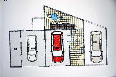 2階部分。洗面やトイレにナナメの線を使って斬新な感じ。三角の土地に三角の家を建てる面白さ。直角ではない空間の面白さ。C案で気になった脱衣場の狭さも解消されている。A、C、D案と3つの案がこの階段配置だったわけだが、2階部分はコレが一番マトモか? しかし、エレベータホール(画像真ん中より僅かに右寄りの収納になっている部分)によってLDKが分断されている感じになり、狭い書斎と狭いリビングと別々の空間になってしまっている。キッチンの目の前が壁になる閉塞感もイマイチだ。しかし、今回の4案の中から良い所取りで1つの案を作ってもらう事にした。現時点でこの間取りは使えないと思っているのだが、階段を横置きにした案は他には無く、横置き階段を発展させて面白いモノが造れるかどうか? その可能性を捨てたくなかった。 同時に、価格ももう一度確認してもらう。初期の頃からかなり案が変わっているので、価格がどう変化しているのかを確認したかった。構造も他社と揃えて再見積もりを依頼した。