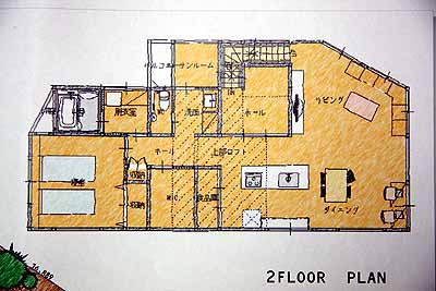 プラン4で出たこの↑階段。このように奥から手前に登るような階段配置。玄関から階段を見せない。玄関ホールを突き抜けた向こうに西側の窓。これを今回のプランに取り入れ、1階部分の耐力壁を変更、エレベータホールを巧く活かして小部屋や収納などにしたい。というわけで、次回のプランに向けていろいろこちらから提案した。が、次回、まったく関係無いプランが登場する事になる!?