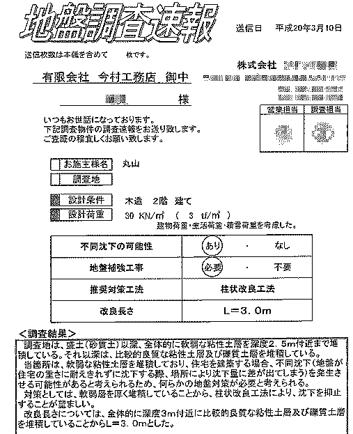 地盤調査が行われたのが3月10日、翌日にはその結果が速報としてPDFファイルで送られてきた。化石が出たとか遺跡が出たという報告は無かった。温泉には期待したのだが...それも無かった(^^;;