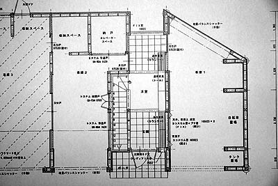 南側ガレージ。斜線部分は強度や耐油性に優れるカラクリート仕上げ。幅は3640mm、奥行きは7280mmだ。西側耐力壁の位置までで言うと奥行きは6370mmとなる。つまり、3640mmX6370mmの壁や柱が無いフラット空間を確保。ロドスタのサイズが1700X4000mmくらいなので、かなり大きな空間と言える。更に、左右の壁の一部を引き戸で仕切った事により、この引き戸を開放すれば、ロドスタのドアを左右同時に全開にする事が可能となる。前後左右に1メートルの空間を確保し、更にドアを全開に出来るように壁と引き戸を配置したわけである。 ちなみに高さは約3000mmくらい。バイクやパーツを収納する独立した倉庫を南端に設置し、この倉庫は3メートルの天井高を活かして上部をロフト構造として、ウイングとかマフラとか、純正シートやバンパーなど、普段用が無いけど捨てられない大物パーツをストックする空間を確保。 EVスペースは将来エレベータを入れるまでは秘密の小部屋として活躍するだろう。2階部分。