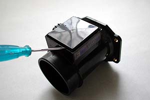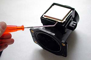 このトラブったエアフロ、エンジンが掛かっている時にコネクタ部分に触ると突然エンジン不調になる。調子がよい時は良いのだが、突然不調になる。走行中に突然吹けなくなってマフラから黒煙を噴いたりとか、アクセルオフでエンストしたり。ダイアグノーシスにはナニも出ない場合とエアフロ不良のコードが出る場合が有るようだ。どうもコネクタ部分が怪しい。分解してみるのだ。