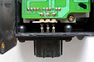 すると基盤が見えてくるわけだ。写真下側にコネクタ部分が有るが、このコネクタは三極端子になっていて、その端子がそのまま基盤に半田付けされている。