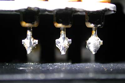 これだ。ピックツールでちょっと浮かせているのだが、完全に半田にクラックが入って浮いているのが解る。ちなみにこの超マクロ撮影は Nikon E990(Coolpix990ね)を使用している。このページの他の写真もすべてE990で撮影している。