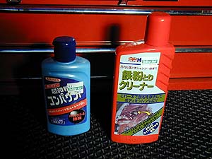 これは酸化物質を完全に分解して落としてしまうという強力なモノらしい。メーカのサイトでは自信満々に紹介されている。が、これもまったく効果無し。鉄粉は落ちないし、消雪パイプの地下水のせいで真っ赤に変色したナンバープレートなども変化無しだった。ナンバーが変色しているのは地下水に含まれる鉄分が塗装表面に付着し、それが酸化しているわけで、メーカの能書き通りに酸化物質を完全に洗い流すのなら落ちるハズなのだが、ソレがまったく変化が無かったって事は効果も無いって事である(笑)。結局、正攻法で超微粒子コンパウンドで磨き始めたのだが、これがちょっとやそっとじゃ落ちない。電動ランダムアクションサンダにタオルバフを付けてやってみたが駄目。そこで作戦変更で、より粒子が粗いコンパウンドから始める事にした。使ったのは極細100番ってヤツ。