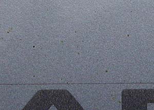 ナニよりも鉄粉が凄い。この写真は横50mmくらいの範囲が写ってるんだけど、黒い点々に見えるのが全部鉄粉だ。恐るべき量の鉄粉。それも強烈に塗装面に食い込んで一体化している。こんなスゴイ量とスゴイ食い込みの鉄粉は見た事が無い。爪で擦るとパキって音がして飛んで行く。ルーフやボンネットには鉄粉がほとんど無く、ボディの下半分とリヤゲートがすごい。多分、余程鉄粉が多い地域を毎日のように走っていたのだろう。リヤスポイラの上よりも裏の方が鉄粉が酷いし。さて、これをどうやって落とせば良いのか?? なんとか簡単に落ちる技は無いのか?そこで買い求めてみたのが以下