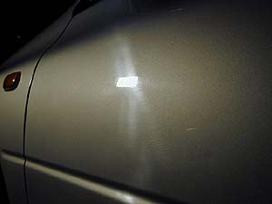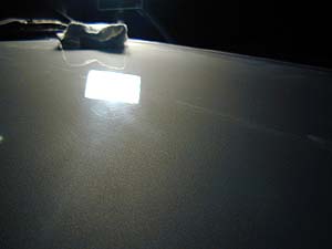 解かるだろうか? ハロゲン灯の映り込みの場所を境にして手前が極細コンパウンドで磨いた面、奥が超微粒子コンパウンドで仕上げた面だ。乱反射の有る無しで判別できる。フェンダラインに沿って並行に磨きの境目が見えるんだけど。雑巾が映り込んでいる部分はもちろん超微粒子で仕上げた面だ。