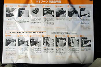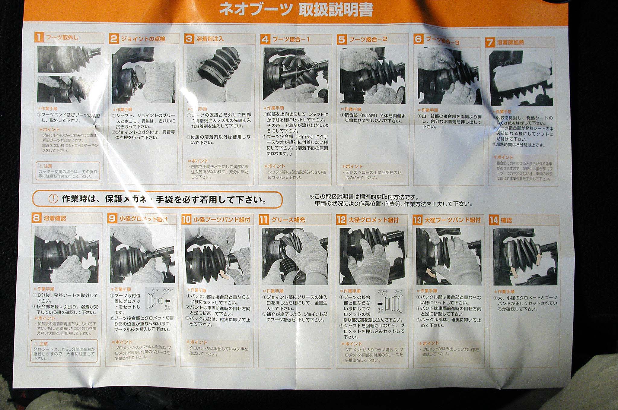 詳しい説明書が付いてくる。画像クリックで超大型画像へジャンプ。古いブーツをカッターで切断して外し、分割ブーツを被せ、シャフトの上で溶着、溶着部分を付属のホッカイロで加熱して乾燥、グロメットを挟んでバンドで固定すれば完成だ。