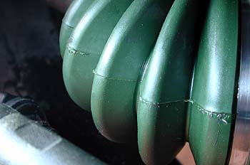 こちらは接合部ではなく、反対側にある金型のパーテングラインだ。良く見なければ接合部との区別が出来ないくらいに接合部の完成度は高い。従来のMタッチは品質が低くてとてもじゃないが使い物ならなかったのだが、このネオブーツは品質や信頼性がかなり高いような気がする。DIYで出来る作業だし、高価なドライブシャフトブーツ交換も手間さえ惜しまなければ安価に済ませる事が出来る。気合が有るヒトは自分でやってみるもの良いのではないか? 説明書に従って作業を進めれば特に難しい作業ではない。