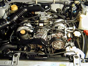 一見するとゴチャゴチャしてる様に見えるけど、実は隙間だらけで整備性はとっても良い。低い位置にある水平対向エンジンの上に、P/S、発電機、ACコンプレッサなどの補機類が一番上に並んで載ってる感じ。スロットルやインジェクタ、各種センサなどのEGI関連部品もすぐに手が届くところに有る。スタータも上にポンと載ってる。ベルト調整やタイミングベルト交換なんか超簡単。うわはは。これこそ理想の4WDレイアウトだ。スバル万歳っ!で、この6年落ち6万キロ走行の中古車をこれから仕上げていくのだ。浮世離れしたFire号をいじってる様子よりも、こちらの方が読者の皆さんには役に立つカモ?(笑)
