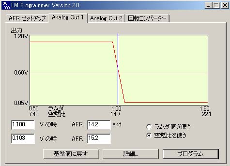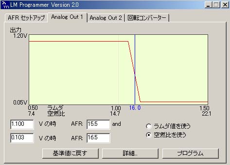 これが純正センサ相当にプログラミングしたモノ。14.7を境に電圧が急変するナローバンドセンサになっている。純正センサはこれとほぼ同等の出力特性を持っている。