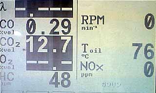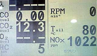 完全暖機後の負荷2000rpm固定で測定。λセンサと回転数のピックアップは接続してない。CO、CO2、HC、NOx、油温、を測定中。