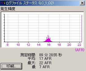 実際のエコランアタック時の325Km分のA/F値の分布がコレ。22以上にピークが有るのは燃料カット領域。燃料カット部を除けば16付近を境に制御されているのが解るハズ。平均が17と出ているのは燃料カット領域も含めて平均化されているからで、燃料カット領域を除けば16付近が平均値になるハズ。ログ上で14を超える増量補正がまったく存在してない事も解るハズで、いかに大人しく走っているかが解るかと。