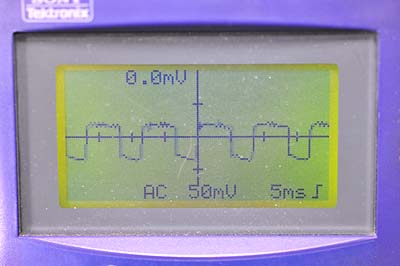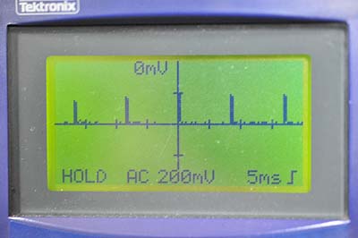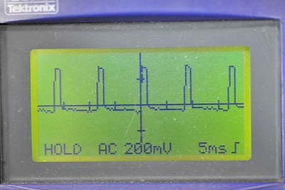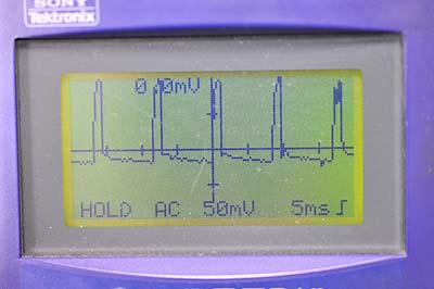 続いて約14.5Vくらいまで徐々に電圧を上げていく。この過程は放電状態によって異なり、満充電に近くて充電の必要が無いバッテリだとあっという間に終わる。放電気味のバッテリの場合はかなり長時間充電しつづける。この時の波形は最初の波形と明らかに違う。そして14.5Vくらいまで上昇すると一旦電流が停止する。波形の高さは125mVくらい。