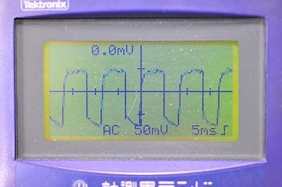 終了直前。16Vを超えた。波形はかなり鋭く高く変化している。波形の高さは300mVくらい。